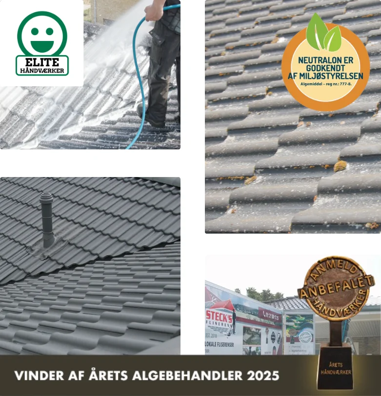 Hos Stecks tilbyder vi professionel og miljøgodkendt algebehandling af tag. Alger på taget forringer ikke kun tagets udseende, men kan også skade tagets struktur og nedsætte levetiden. Med tiden binder alger fugt, hvilket kan føre til frostsprængninger, revner og i sidste ende kostbare reparationer.
